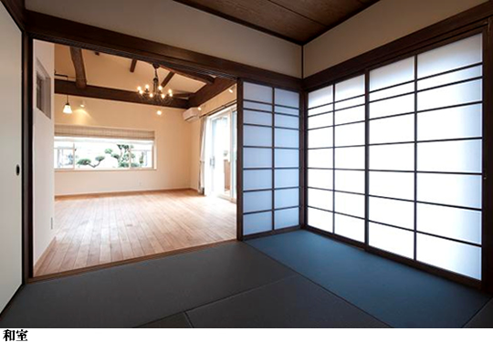 リビングと繋がっている和室は和紙畳に張替え、柱と鴨居を塗装して和モダンに仕上げました。障子の格子も遊び心で上部だけ間隔を変えてみました。普段、扉を開けたままでも、LDKの雰囲気にもマッチできるでしょう。